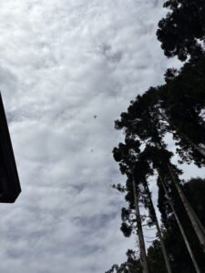 ドローンの操縦:スギの木の遥か上まで飛ばしています