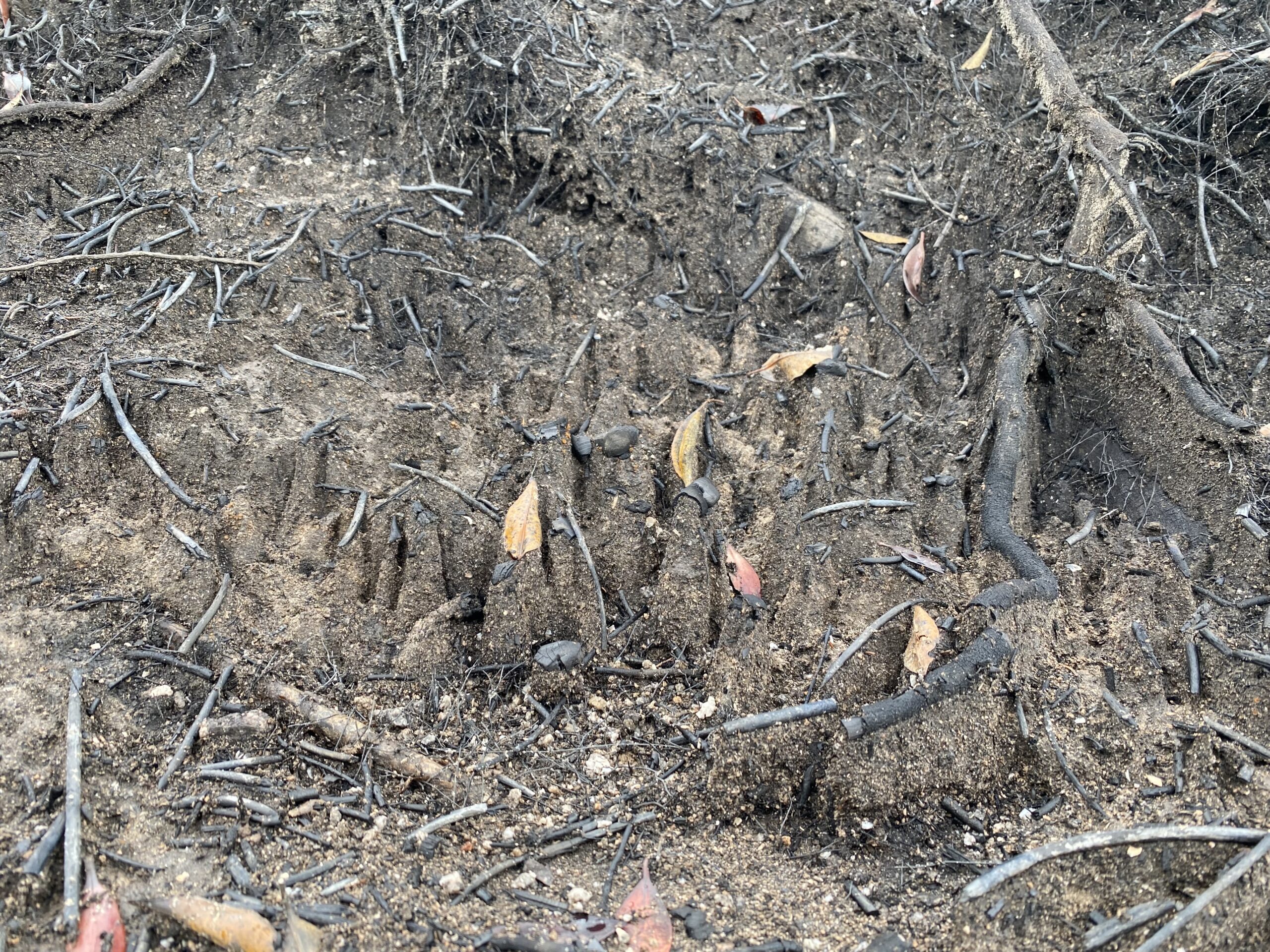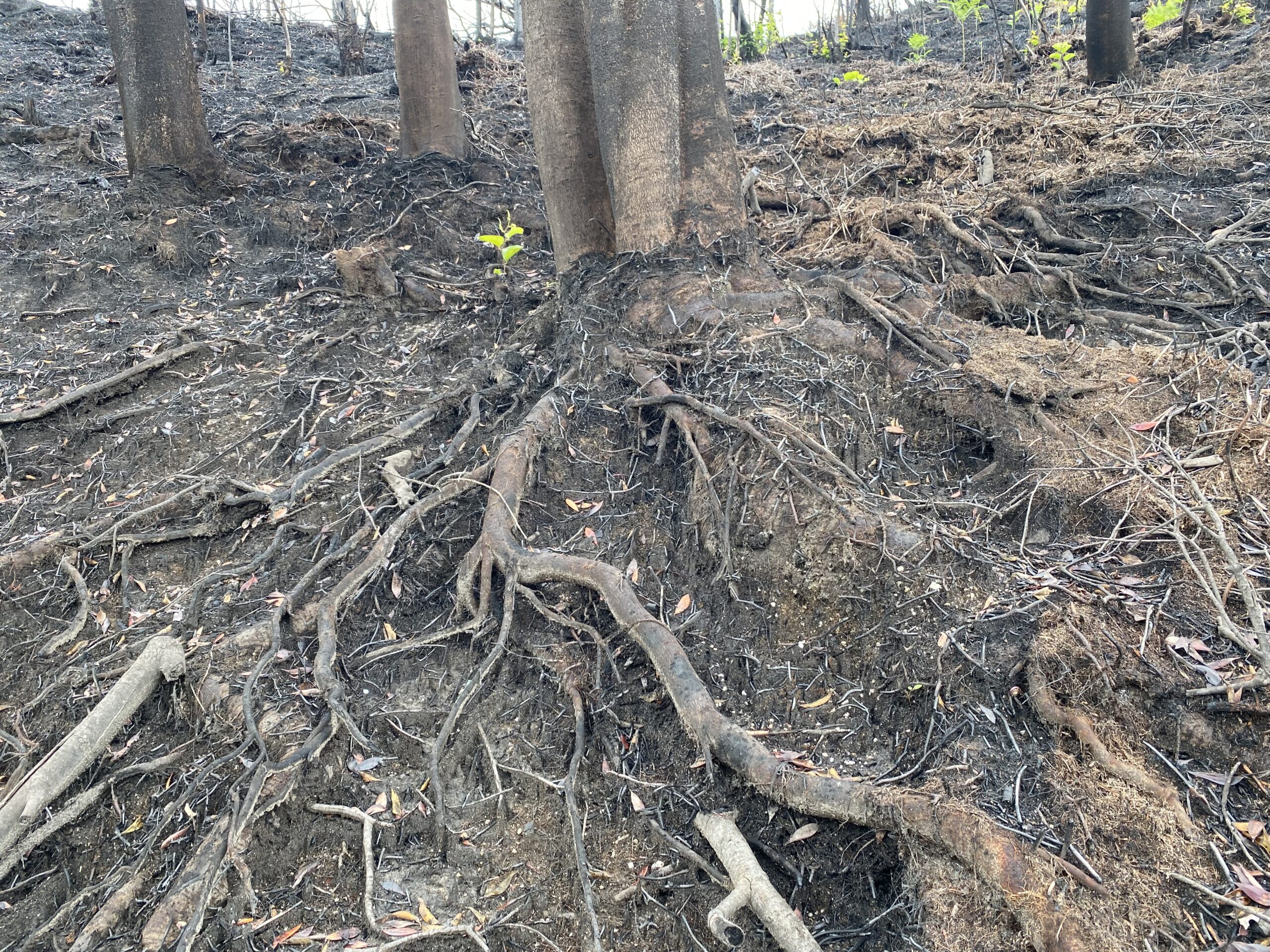 地表面が燃焼して下層植生や落葉層が失われた結果、雨水による侵食がすでに起こっている場所もあるようです。1枚目の写真では土壌が侵食され樹木の根が浮き上がってきています。2枚目の写真では、雨滴侵食によってたくさんの土柱(周囲の土が侵食されて柱状に残った部分のこと)ができているのがわかります。