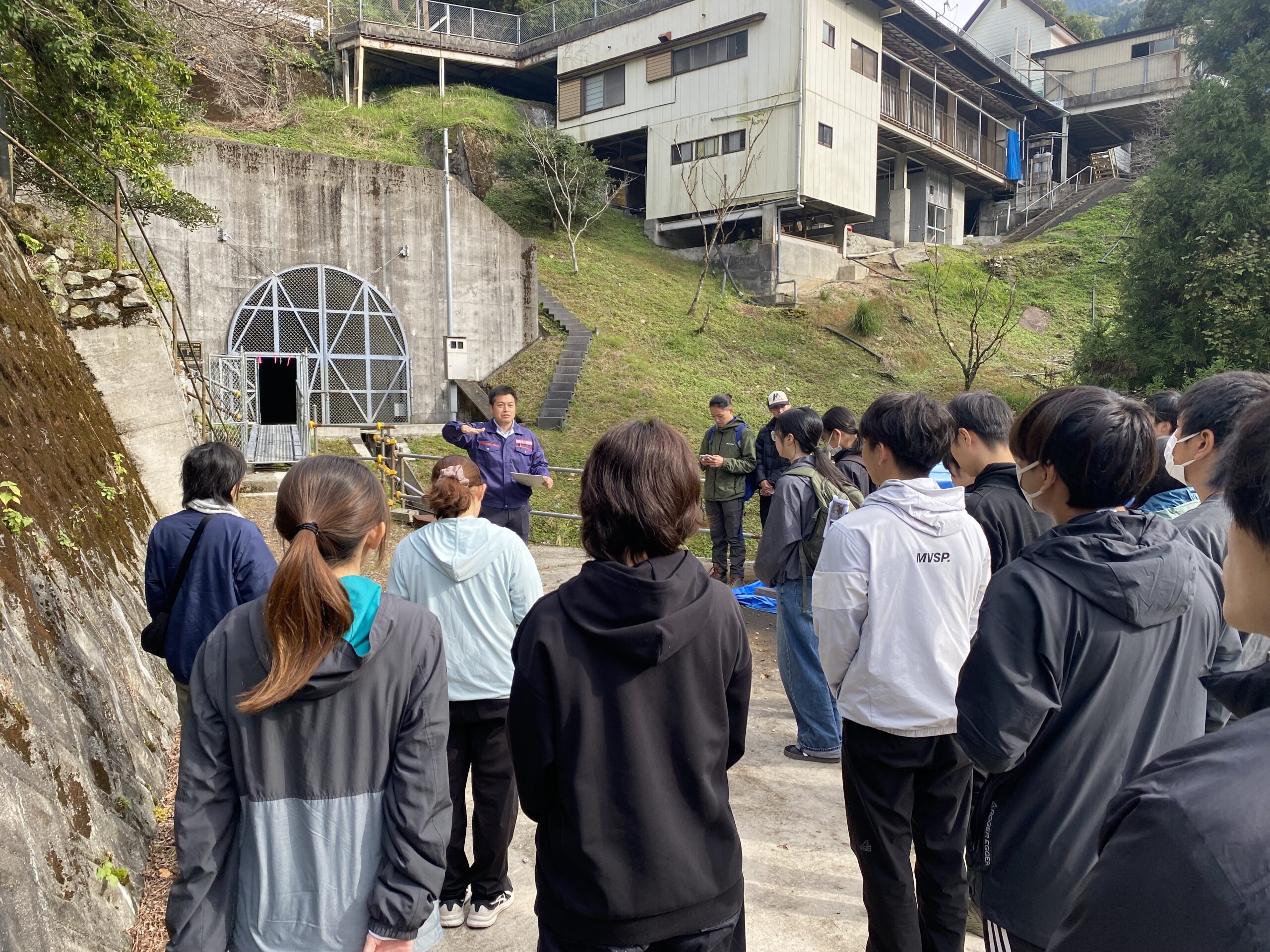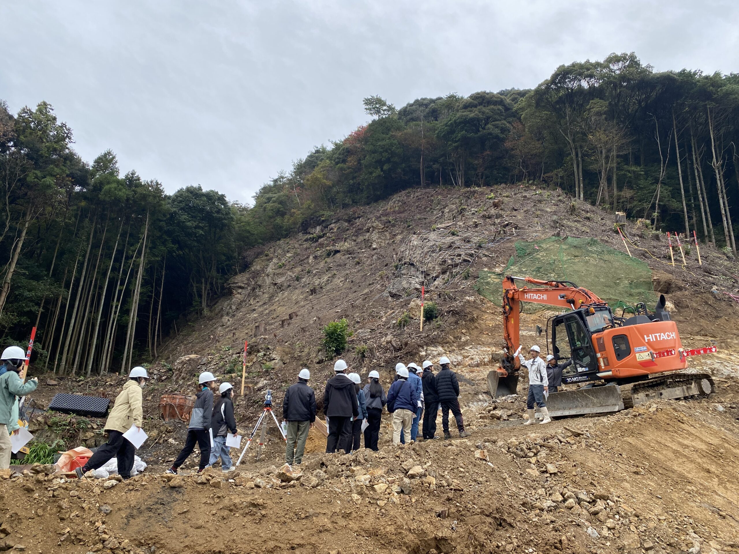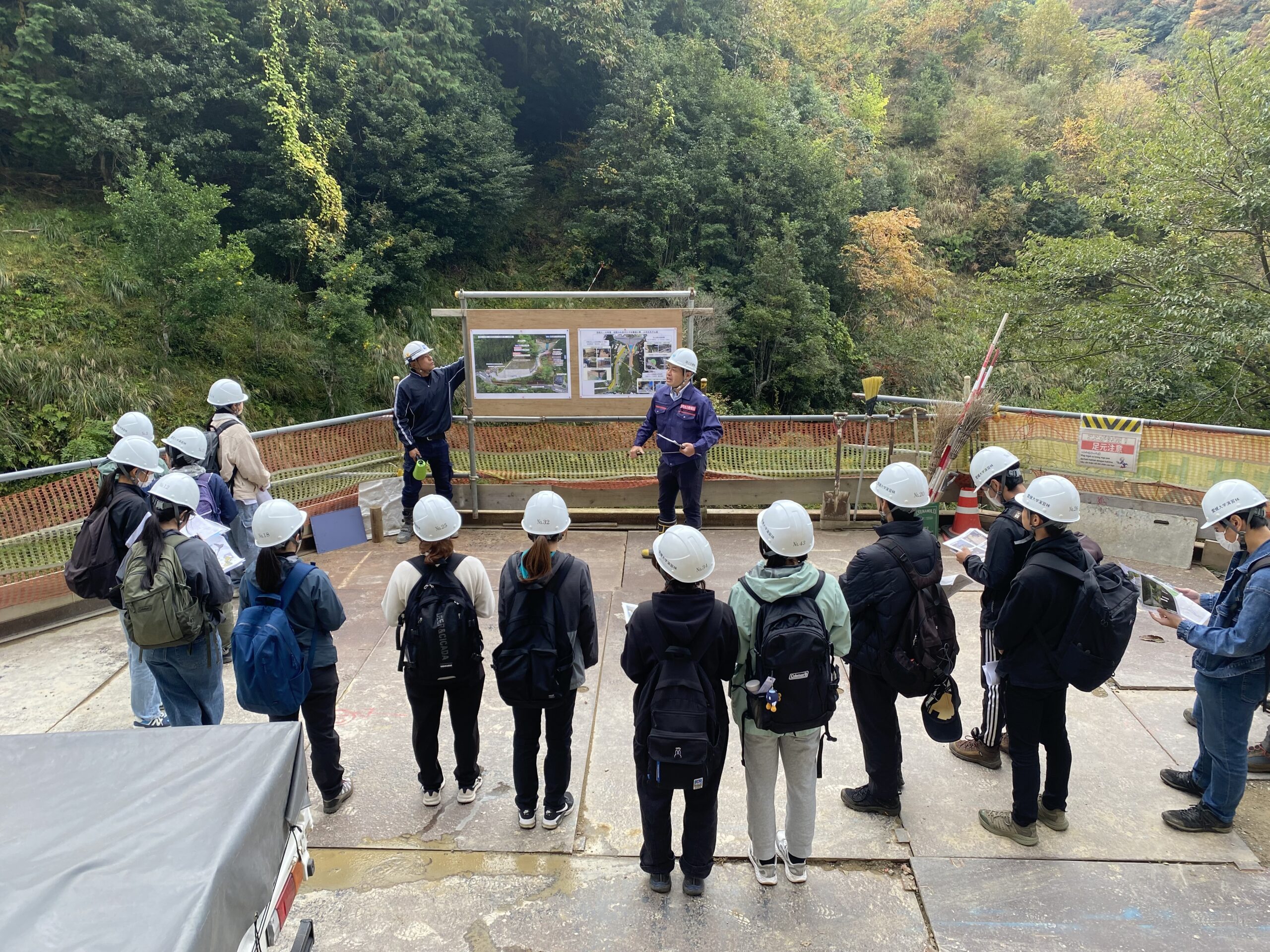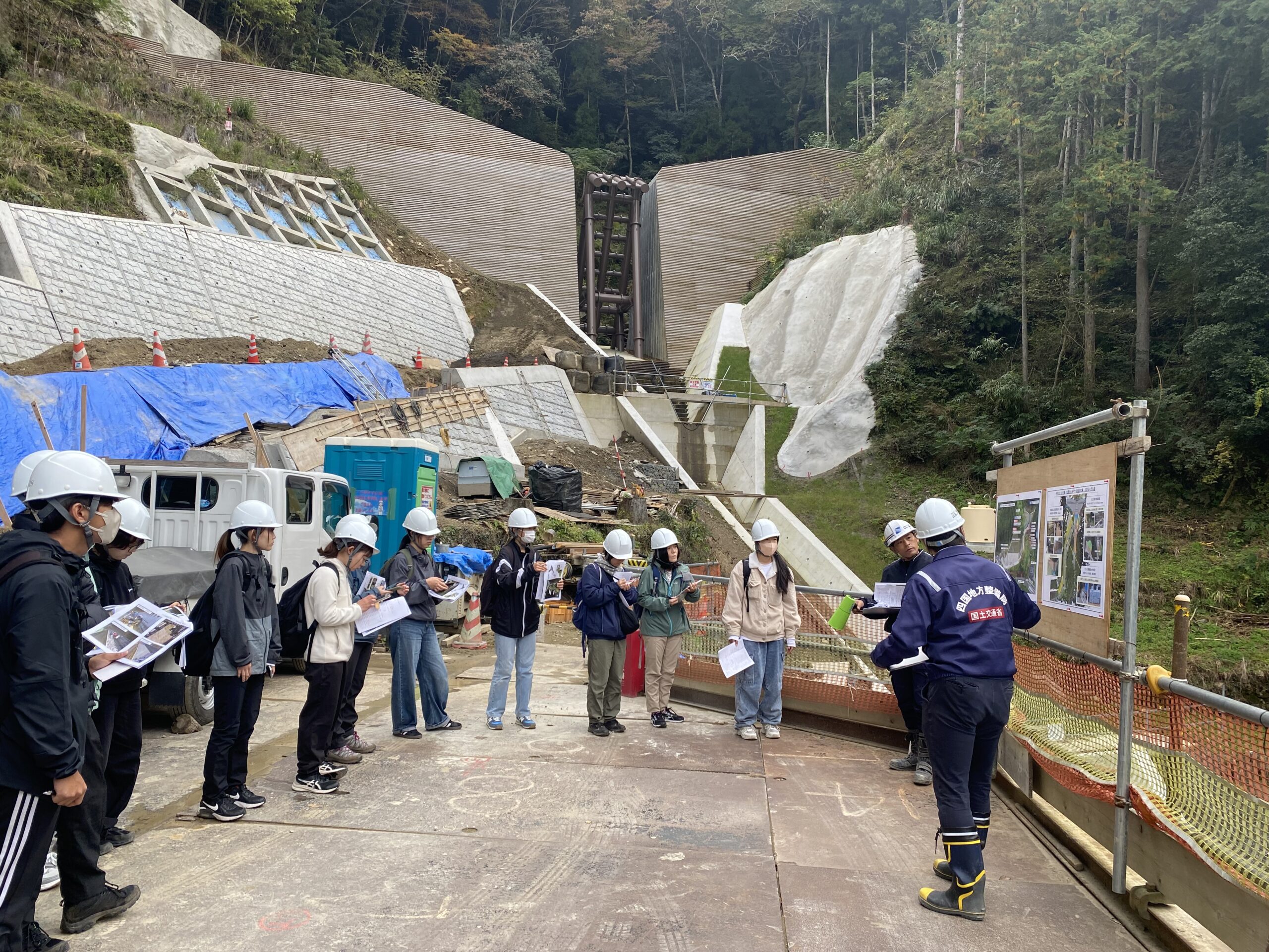 見学に参加した学生は、砂防堰堤や地すべり対策施設を設置する目的や施工方法を学んだほか、最新のICT技術などが現場でどのように活用されているかを学びました。