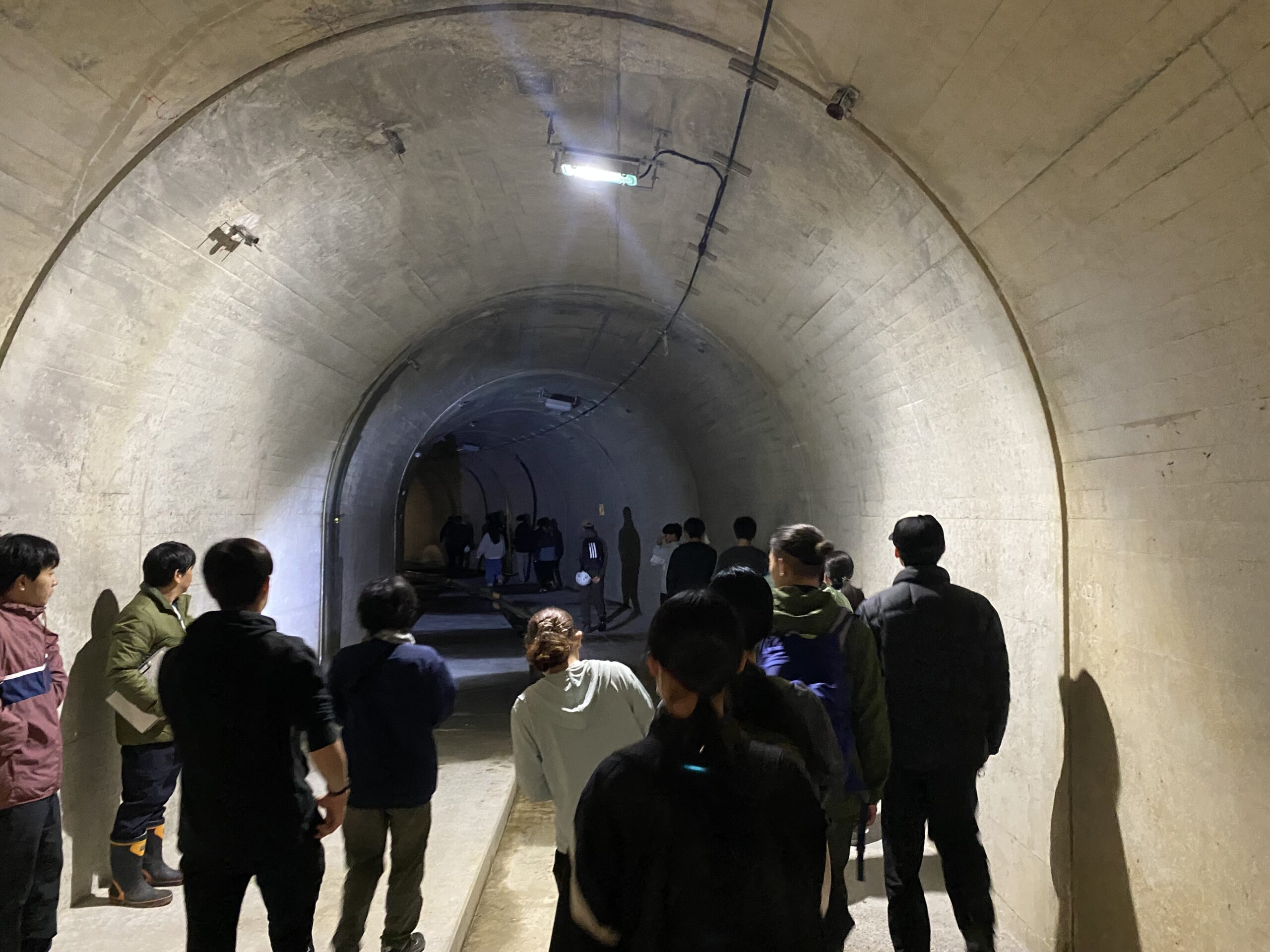写真4, 5:善徳地すべり排水トンネルを見学している様子。トンネル内にも案内していただき、地下水が集排水されている様子を実際に見ることができました。