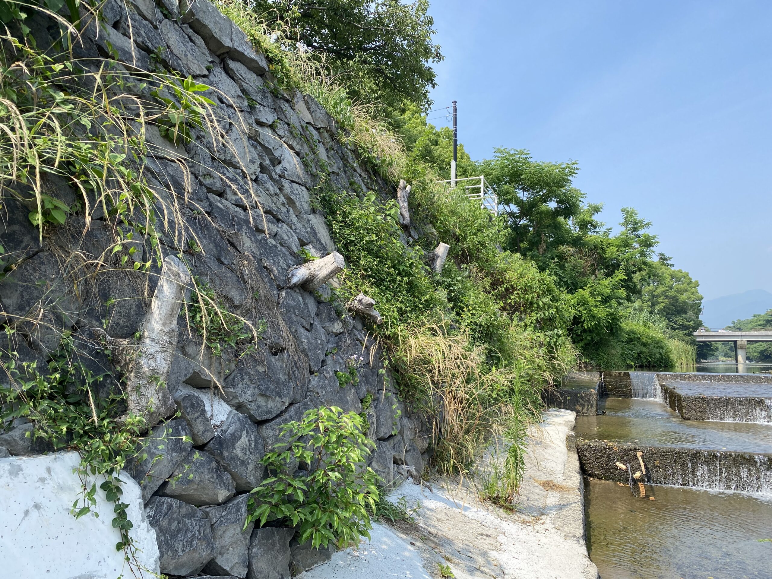 ポスター作成にあたって、岩堰やその周辺の現地調査を行いました。この写真に写る石垣状の構造物は「鎌だし」と呼ばれる堤防の痕跡です。このような河岸から突き出した堤防を複数配置することで流水のいきおいを弱めることを狙ったものだそうです。