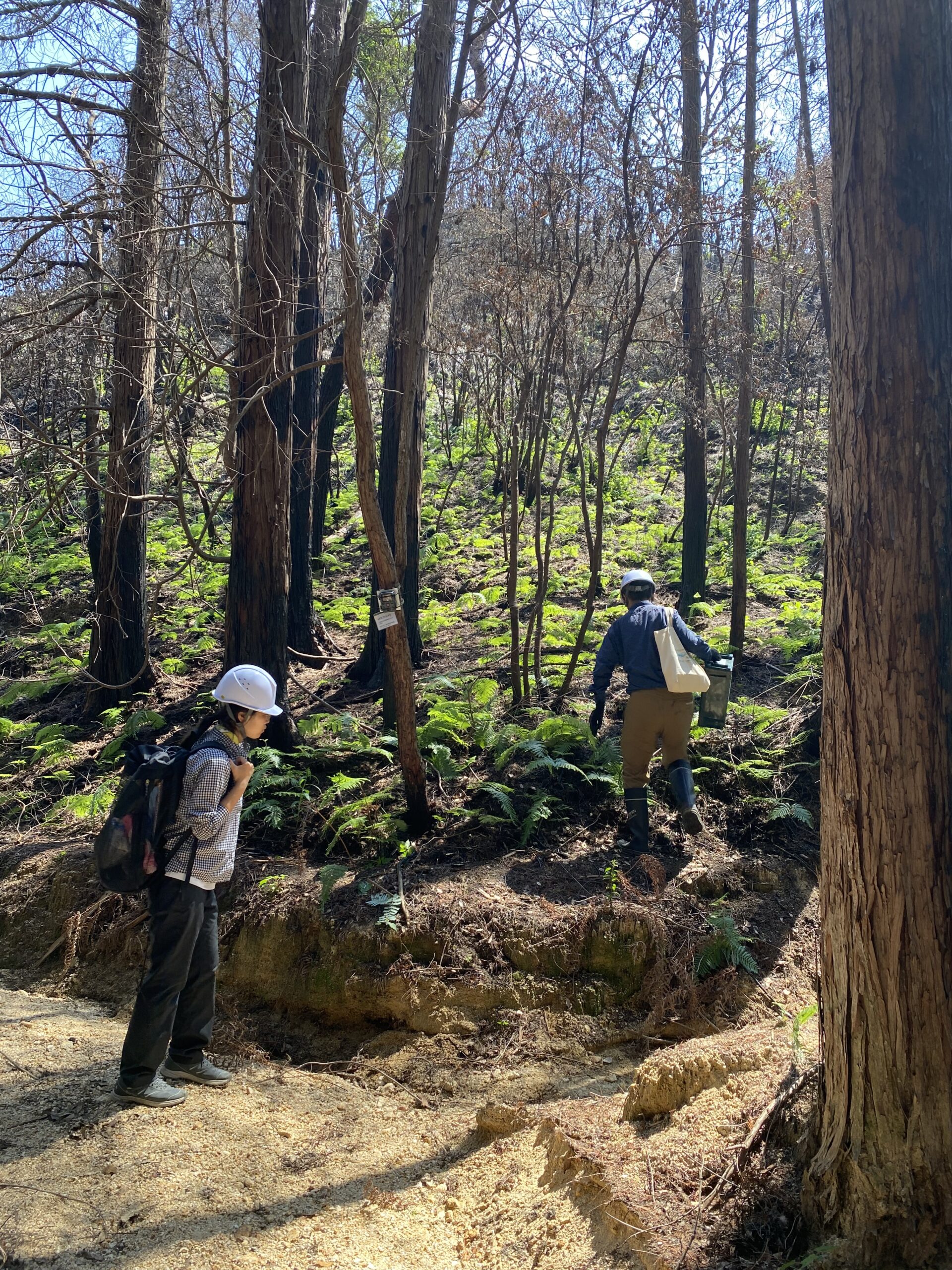 樹幹が焼損した立木は葉の色が褐変し衰弱している一方で、林床はシダ類によって再び覆われ始めています。
