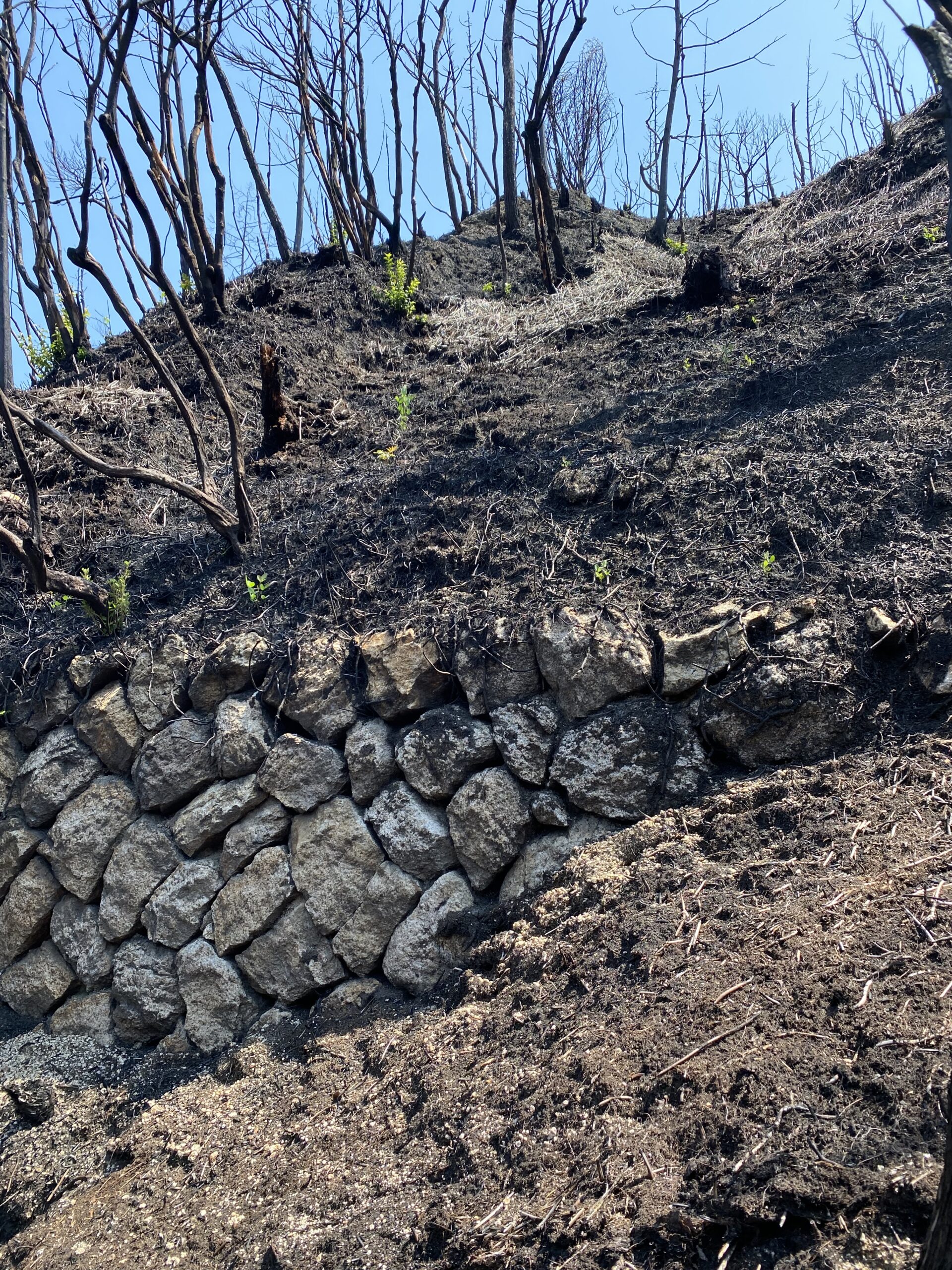 火災以前に行われた治山工事の跡だと思われます。こうした過去に(恐らくははげ山の緑化が目的で)設置された構造物が今回の火災以後にも侵食抑止などの効果を発揮するのか興味深いところです。