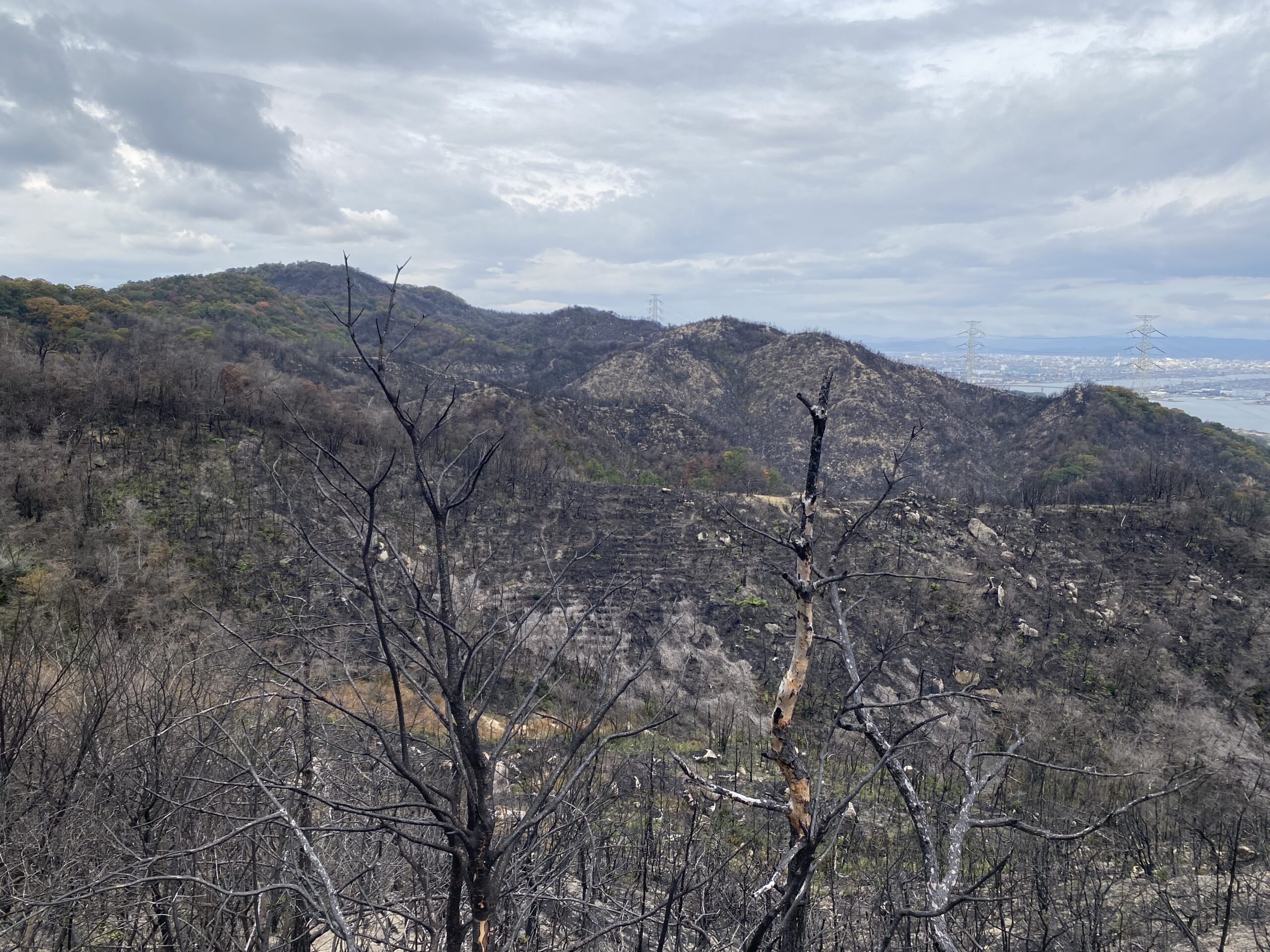写真1:シンポジウム翌日に立ち寄った岡山市・玉野市の山林火災被災地の様子。