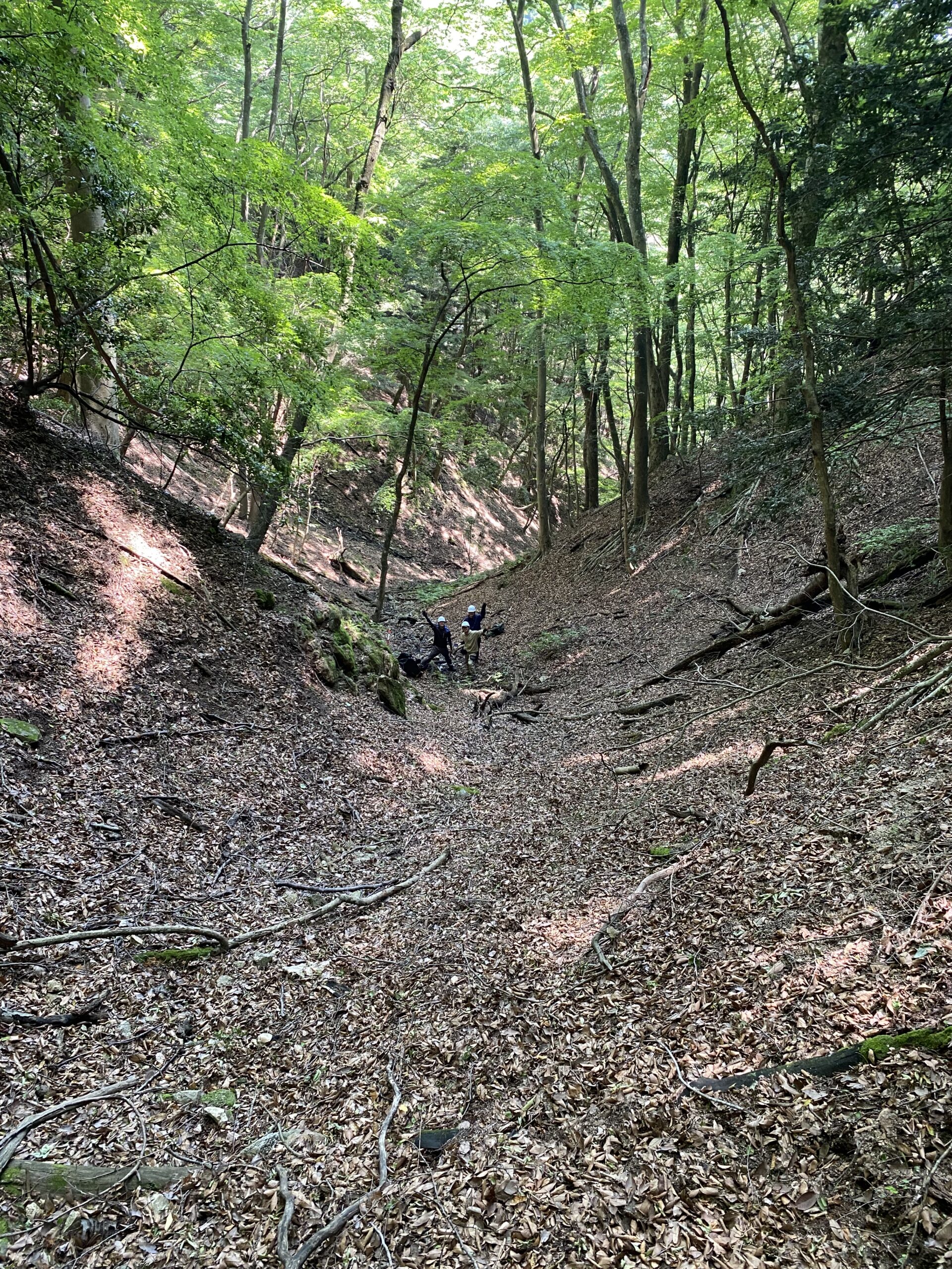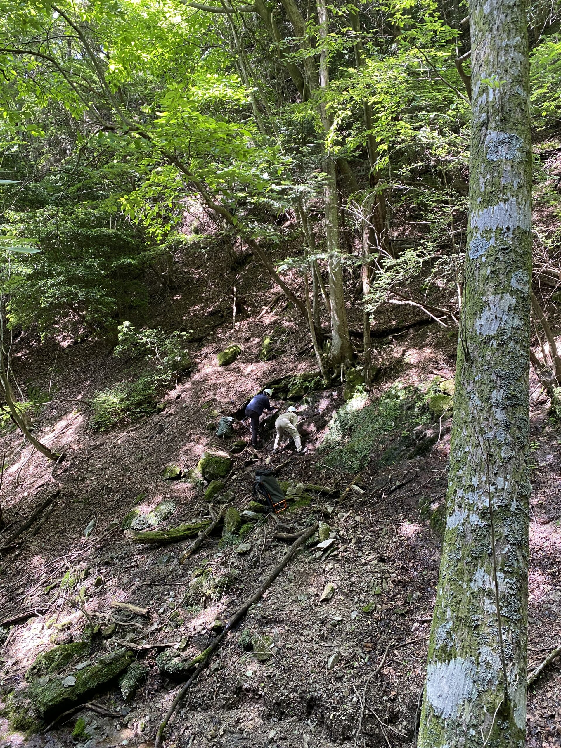 渓流に沿って歩きながら地下水が滲みだしているところを探し、見つけた地点では流量や水温、電気伝導度を測ります。