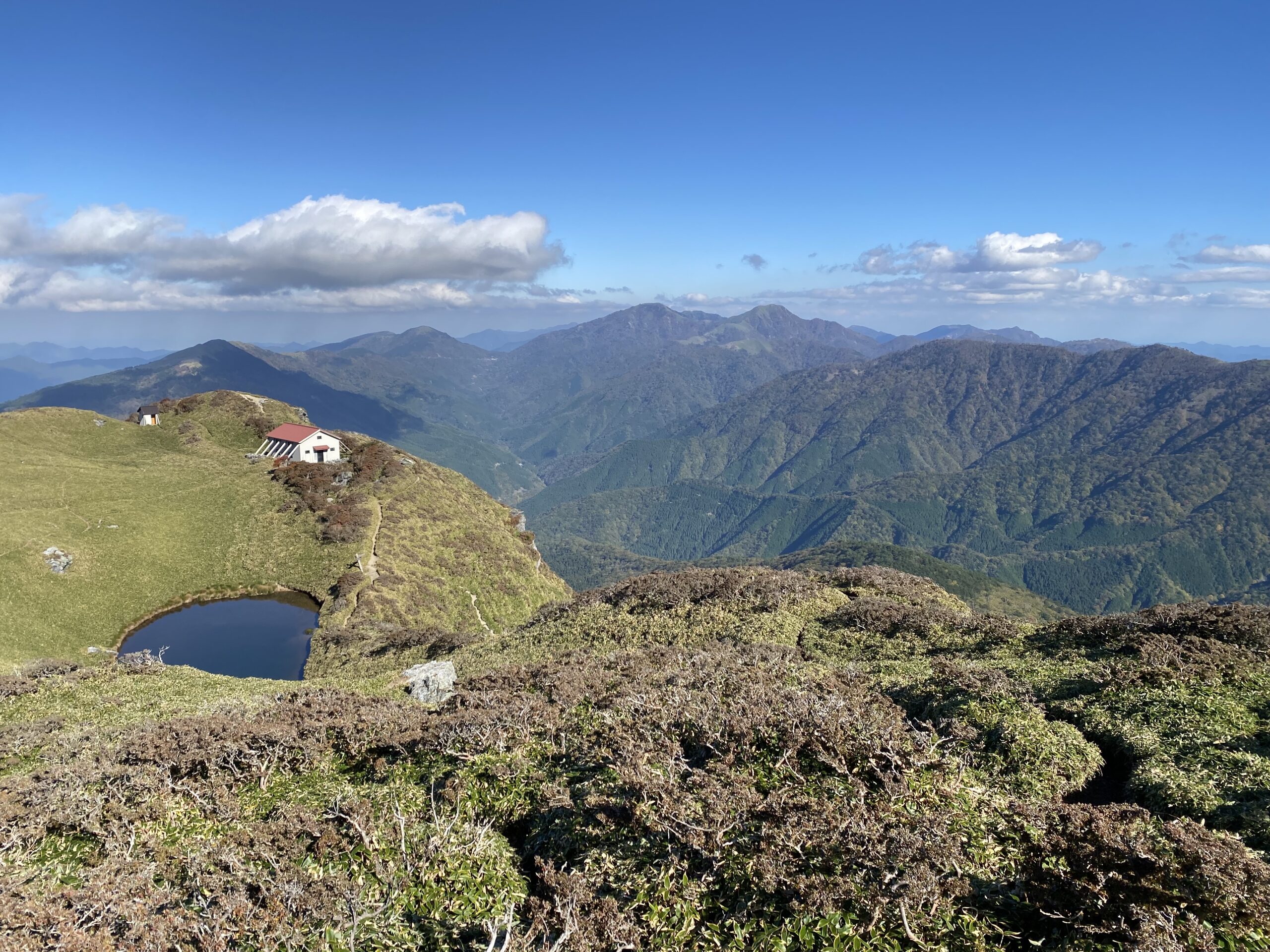 赤い屋根のヒュッテと小さな池がシンボルの三嶺。画面中央奥に見える双子のような2つのピークの左側が剣山(太郎笈、1955 m)、右側が次郎笈(1930 m)。